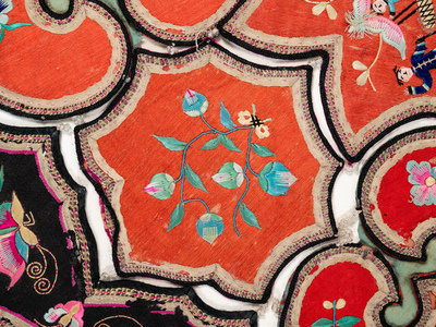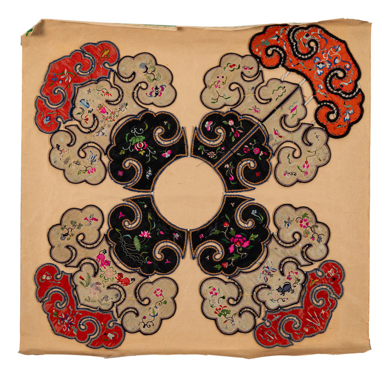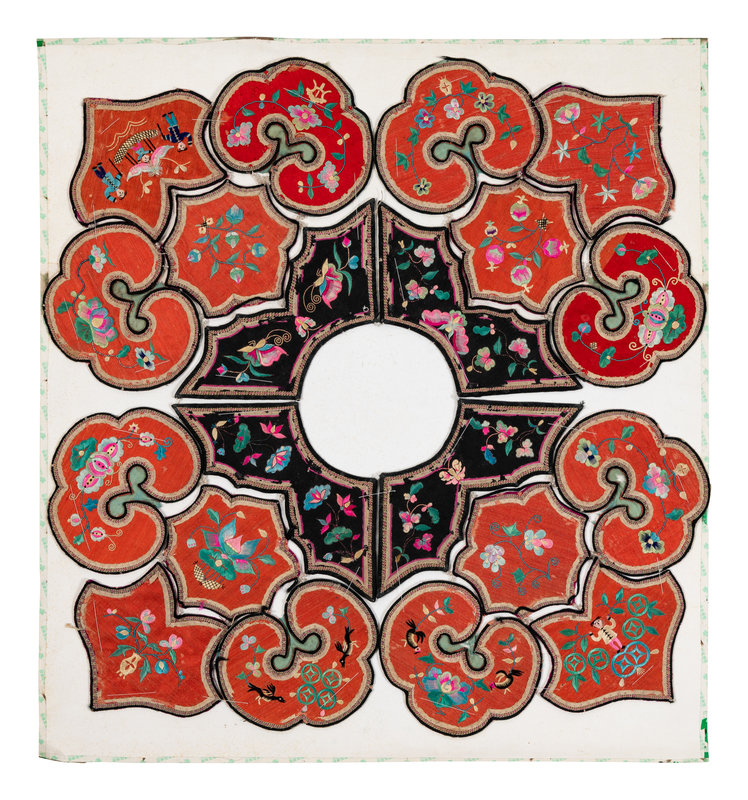 each radiating example worked with delicately embroidered in bright floss with various flowers, figures, creatures, and auspicious symbols, bordered in black outline finely preserved and mounted to a paper backing, comprising one magenta and ice blue ground example, two red and black examples, and one red, black, and cream ground example.