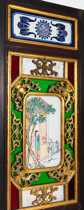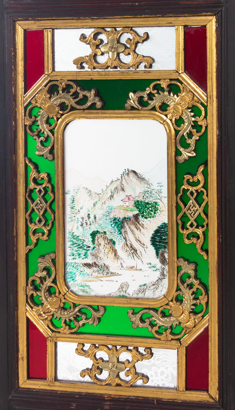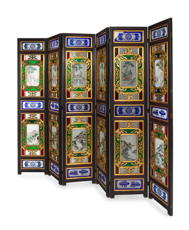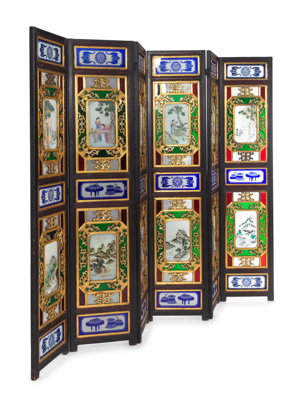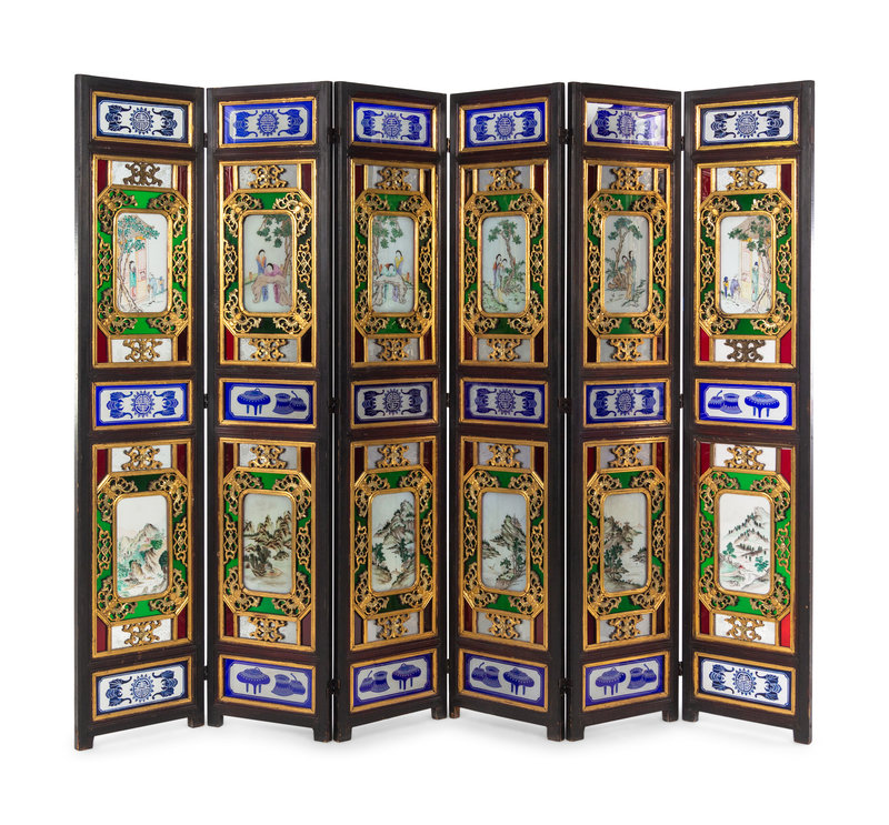 each fold divided into two registers divided by rectangular white plaques painted in blue with various antiquities, bats, and longevity symbols. The main registers having twelve evenly spaced plaques painted in polychrome with landscape and figural scenes, inset within colored glasses panes by gilt metal butterfly form mounts.