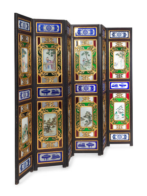 A Chinese Painted Glass Inset Gilt Decorated Hardwood Six-Panel Floor Screen