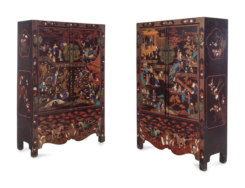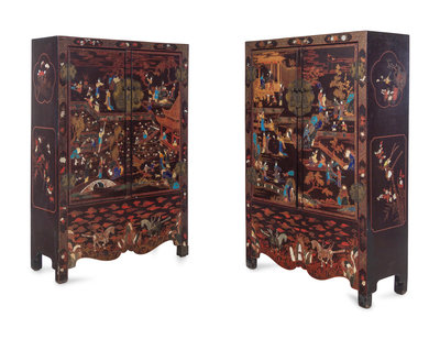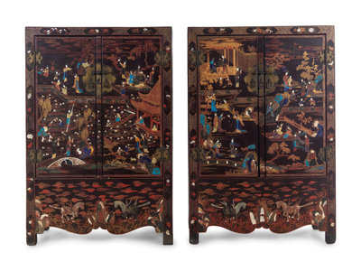 A Large Pair of Chinese Soapstone and Hardstone Inlaid Brown Lacquer Cabinets