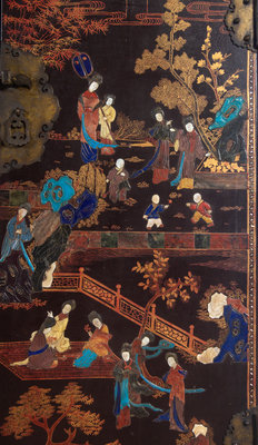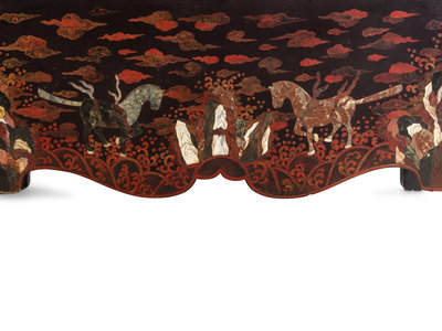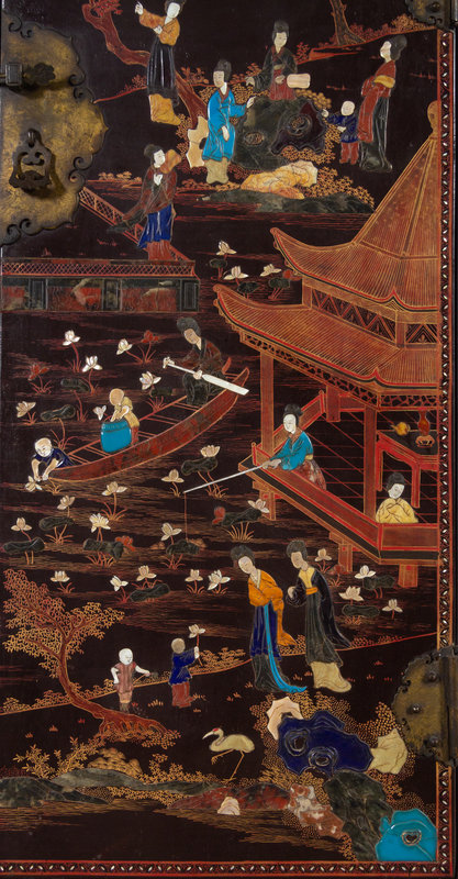 each of rectangular form with four sectioned legs joined by large sprandels decorated with confronting horses, supporting large foldout door richly ornamented with various hardstone inlays to depict numerous figures in a continuous architectural landscape at various tasks.