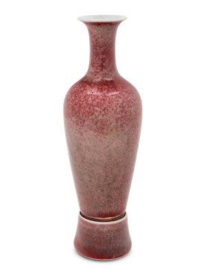 the slender body rising to rounded shoulders supporting a trumpet neck, covered in burnished plum glaze thinning in patches to mushroom tones, all supported by a cylindrical conforming stand.