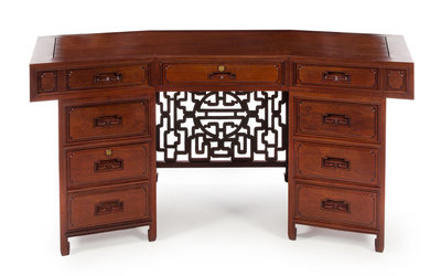 the large top raised above two rectangular cabinets, the exterior carved with shou medallions with archaistic motifs, the two top drawers lacking panels.