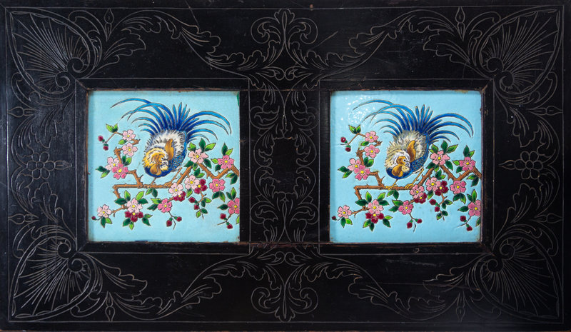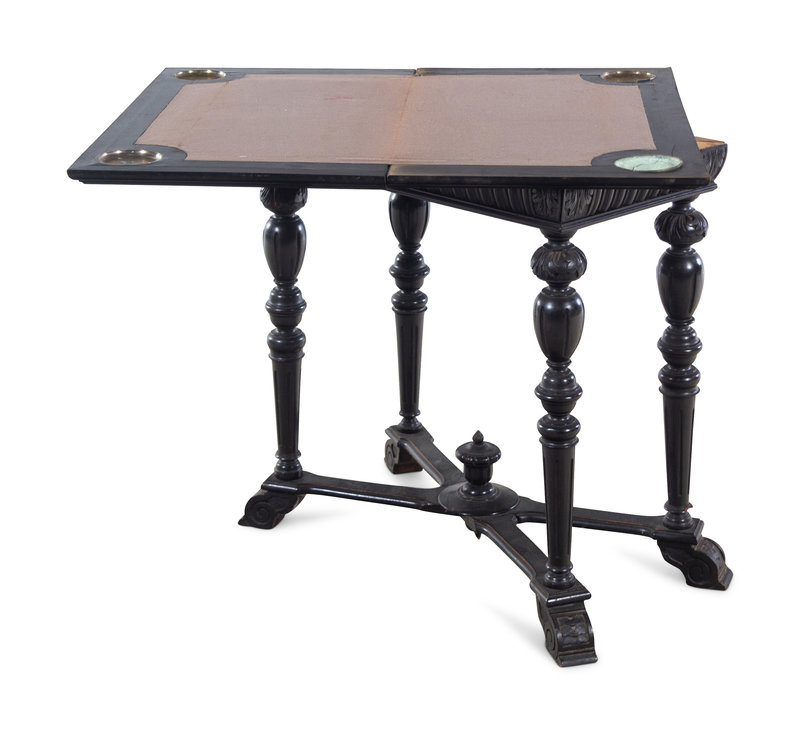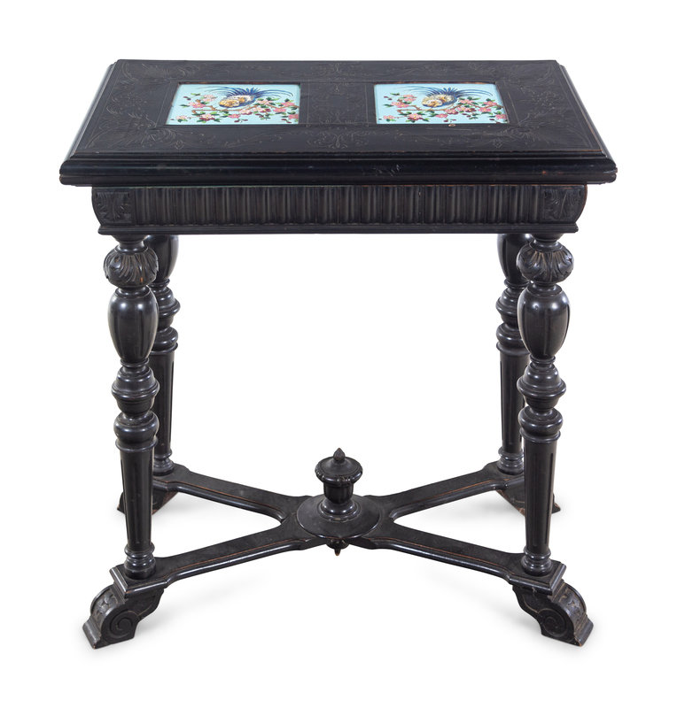 the metered top inset with two blue ground porcelain tiles surrounded by floral details carved in low relief, opening to a felt lined playing surface, all supported by trumpet legs joined by a cross-form stretcher over scroll feet.
