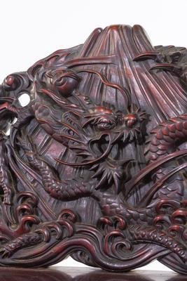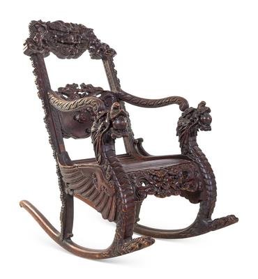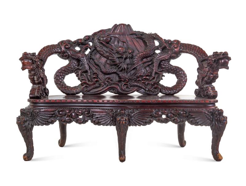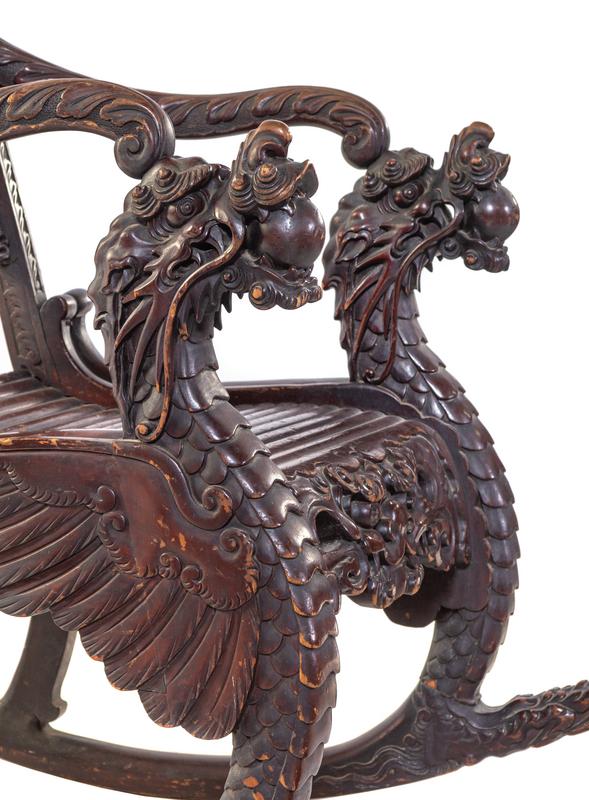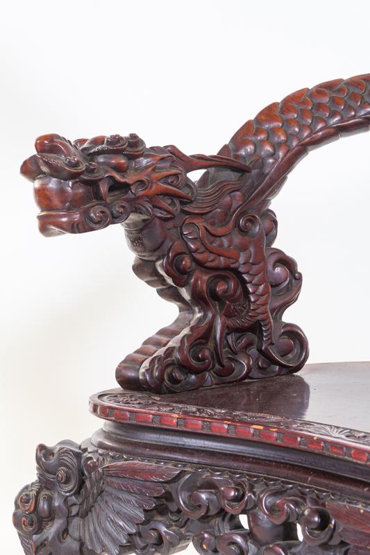 each with shaped crestrail terminating in bold dragon-head handgrips, supported by S-shaped legs.