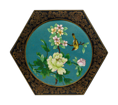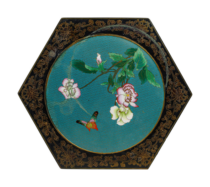 each having a hexagonal metered platform inset with a turquoise panel raised above a reticulated ruyi apron joining six sectioned curving legs joined at ruyi head feet.