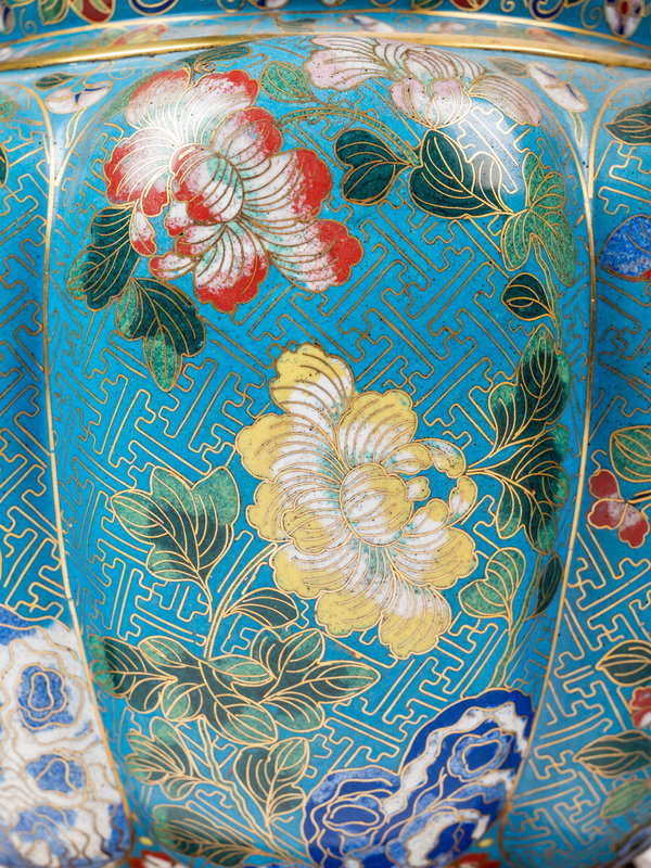 each worked with narrow coils reserving various peonies, gardenias, and hibiscus against a bright turquoise ground, comprising one petite example with a smooth round cover, a larger narrow pair with covers surmounted by gilt finials, and one larger lobed example with a reticulated hardwood cover and stand.