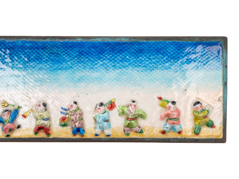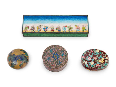 comprising one long rectangular hinged example worked in relief to the cover with boys playing in a simple landscape, and three round examples, two rendered in cloisonné enamels, and one painted with flowers against a ruddy brown ground.