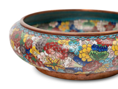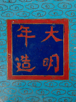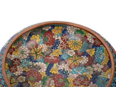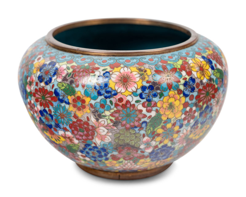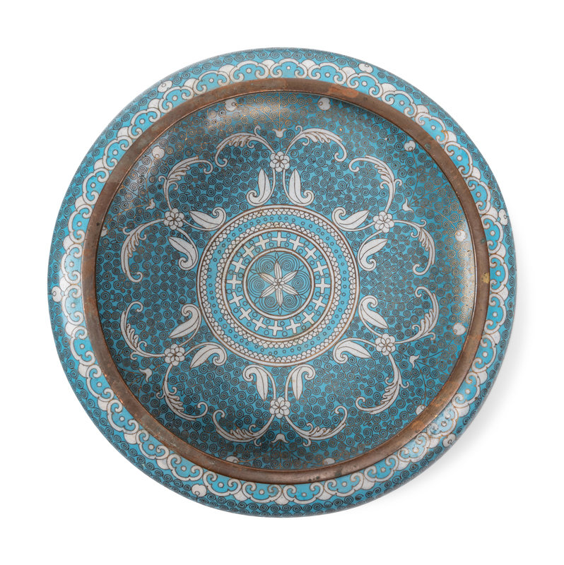 each of compressed low form, the richly ornamented ground worked with twisting wires filled with various shades of turquoise, pale, and royal blue.