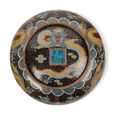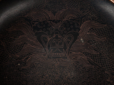 each of circular form with low compressed walls rising to a wide mouth, nine showing sinuous dragons bearing fangs, and one with flowers stems.