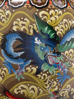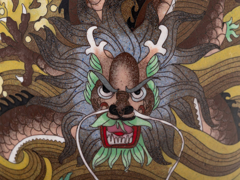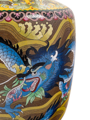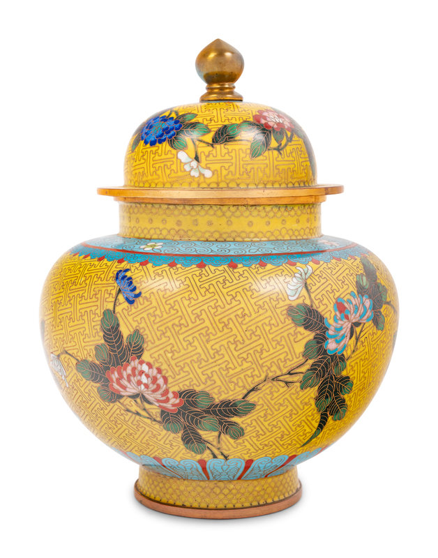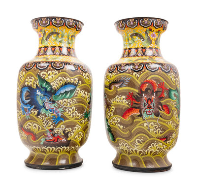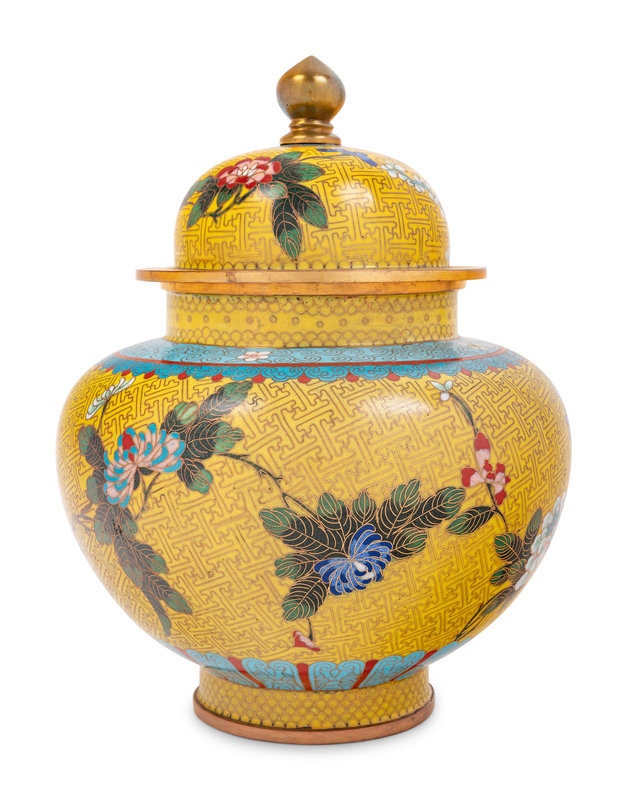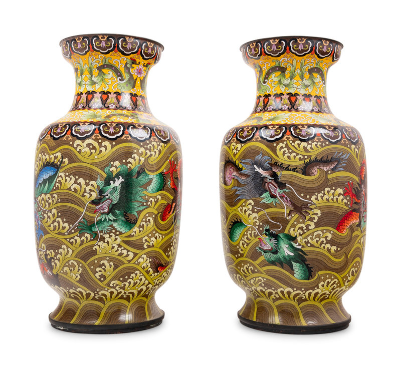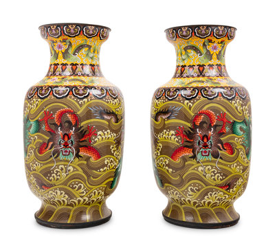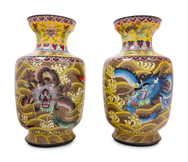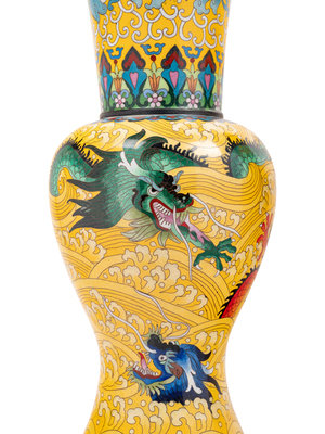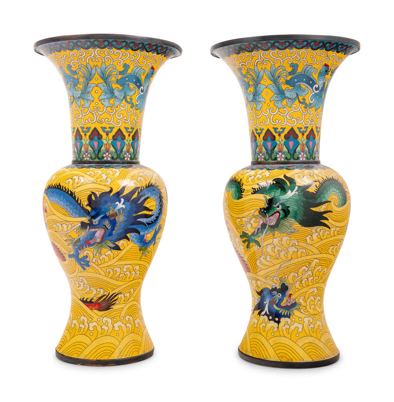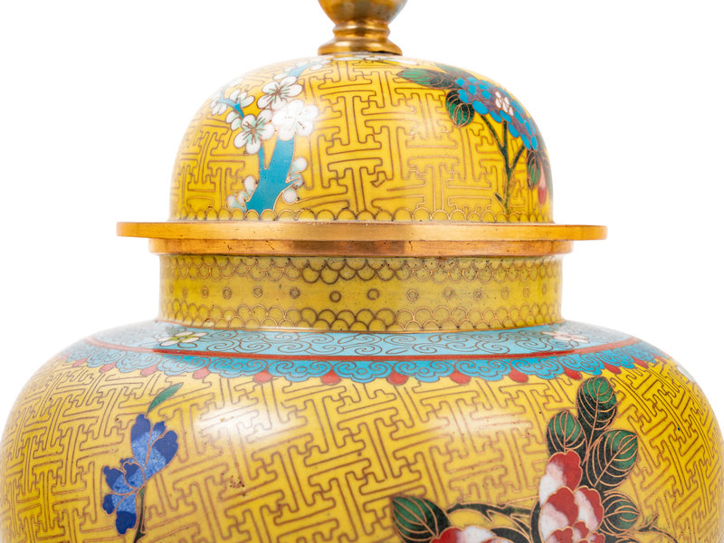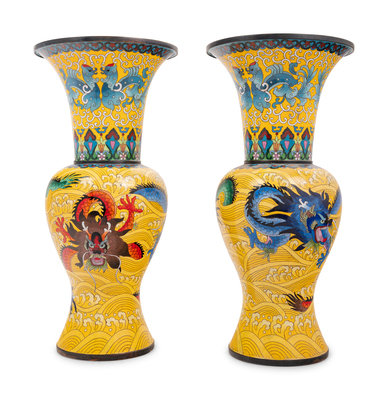 Seven Large Chinese Yellow Ground Cloisonné Enameled Vases