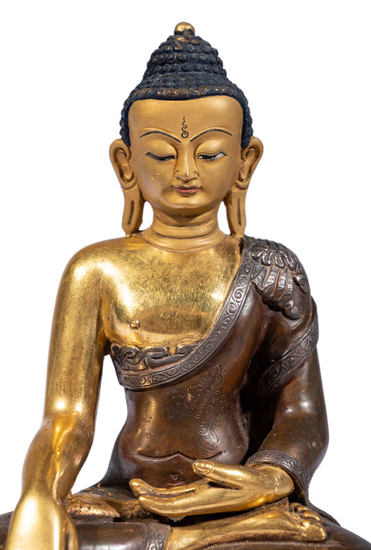 the gilt body cast seated in dhyanasana on a double-lotus base, and the face painted with a meditative expression flanked by long ears, the hair tightly coiled around an ushina.