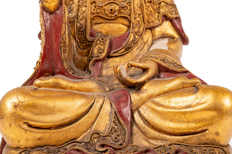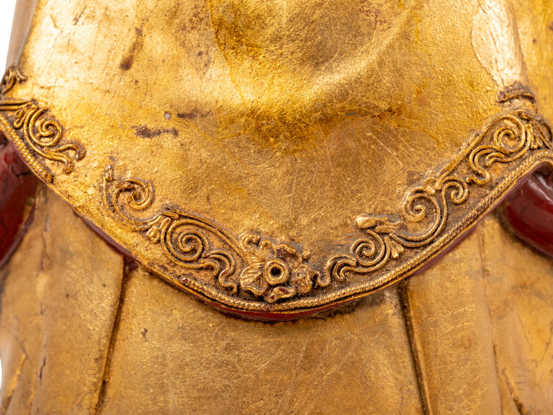 the figure depicted seated in mediation posture cloaked in orated robes worked in in relief with a red-lacquered lining.