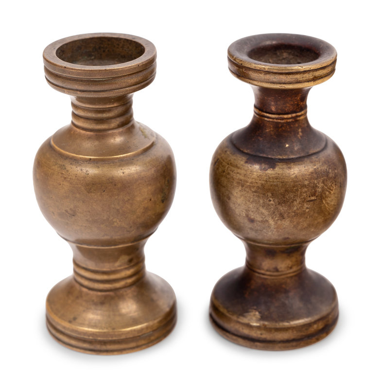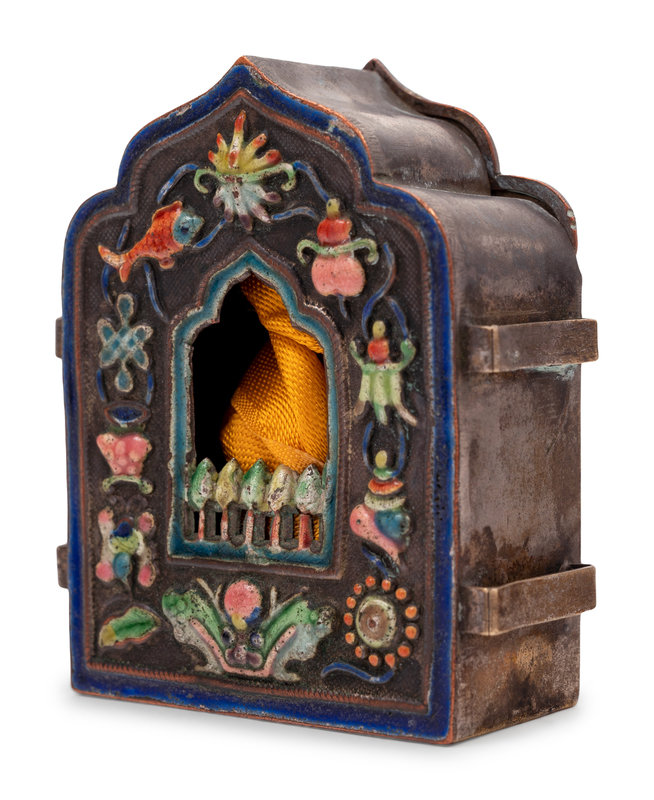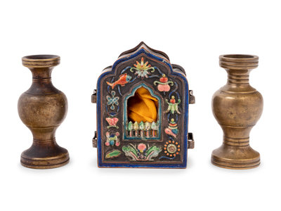 each of the miniature vases having a globular body and spreading foot, the surface with an attractive patina, the miniature shrine having a hinged door and enameled with auspicious emblems about the central window.