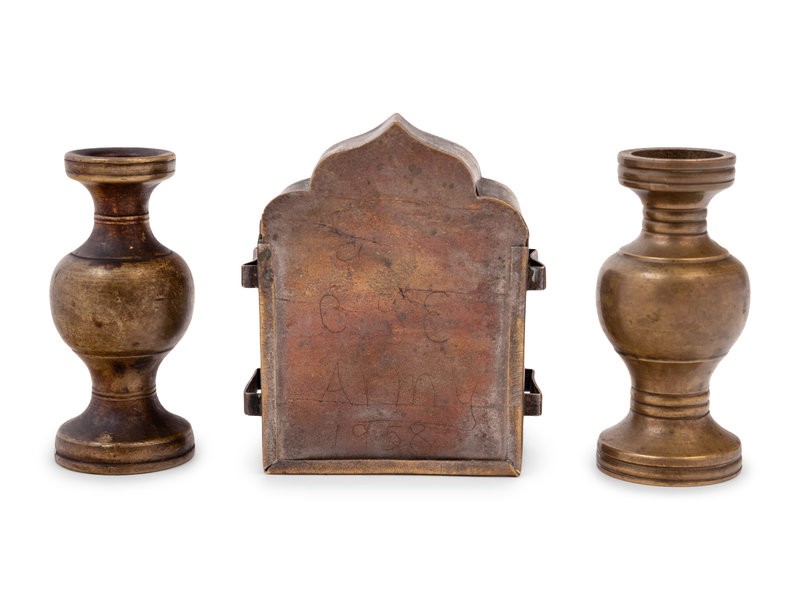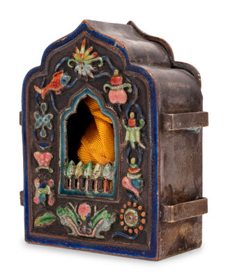 A Small Chinese Enamel on Metal Shrine and A Pair of Chinese Miniature Metal Vases