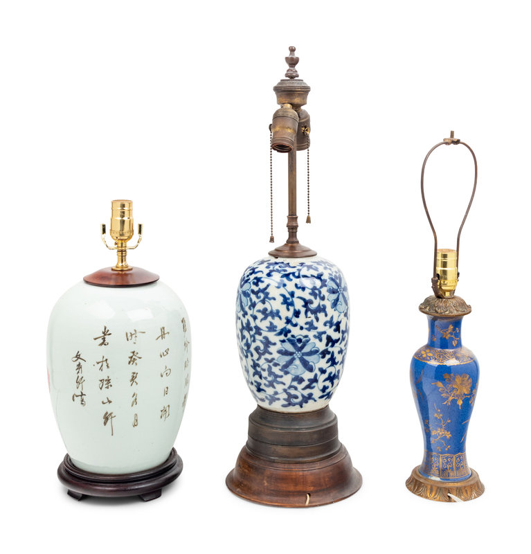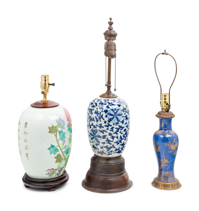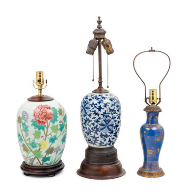 each mounted as a lamp, the first painted with peonies, the second blue and white lotus, the third gilt flowers against a powder blue ground.