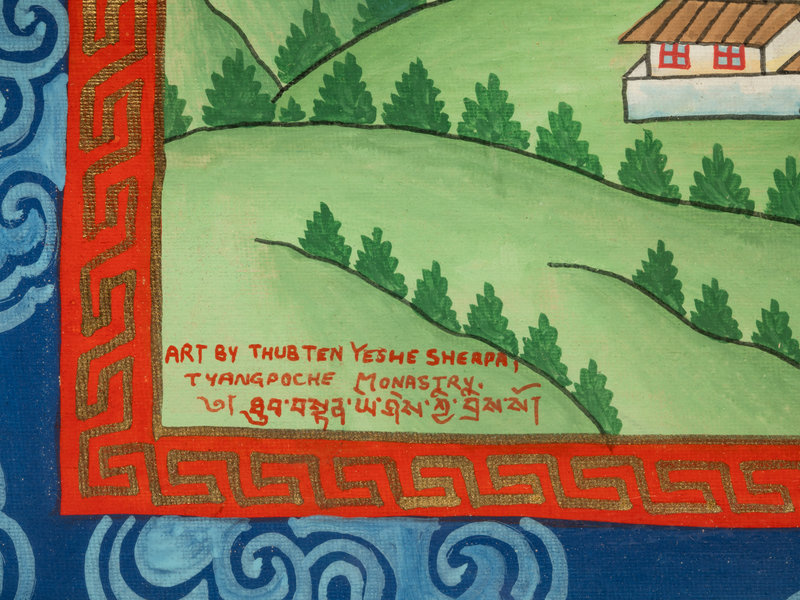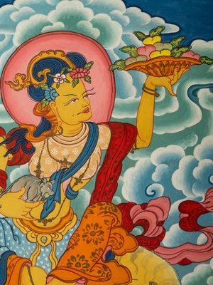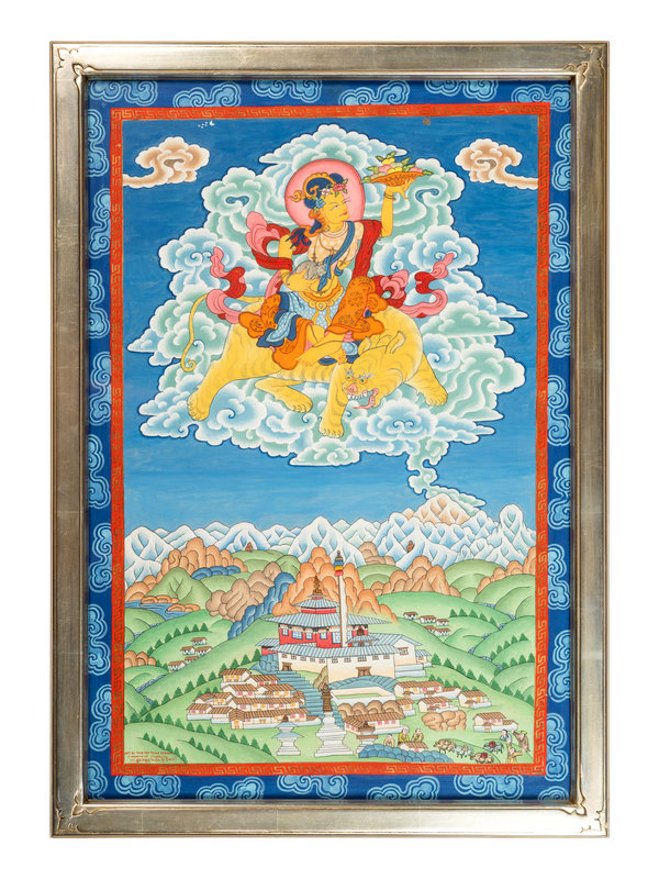 painted to depict a deity riding on a tiger, above a landscape scene, framed.