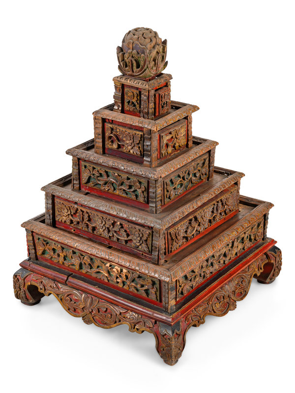 comprising five tiers of square section, each carved in relief with various floral sprays, all surmounted by a lotus bud-form finial.