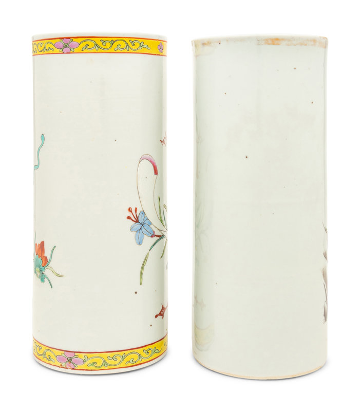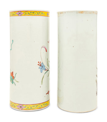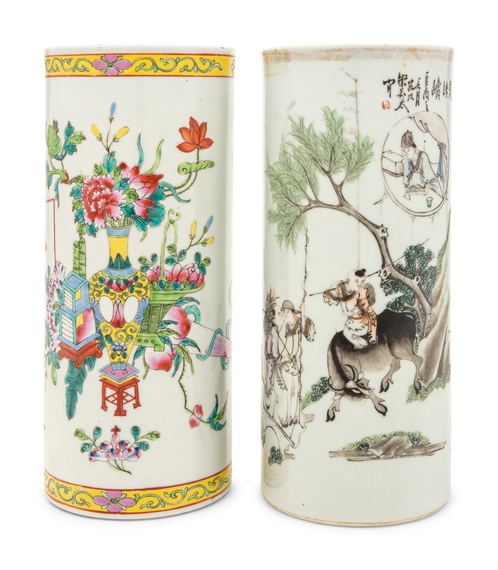 each of even cylindrical form, comprising one grisaille landscape example, and one decorated with bright enamels to show antiques.