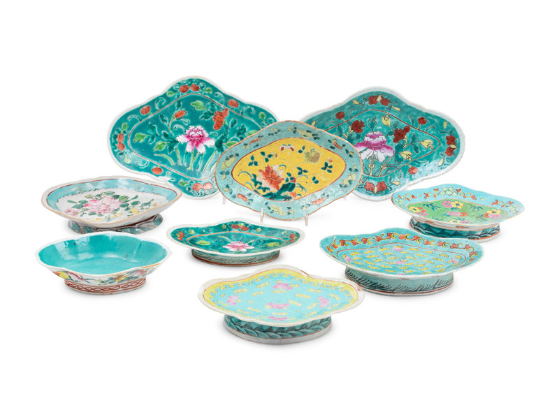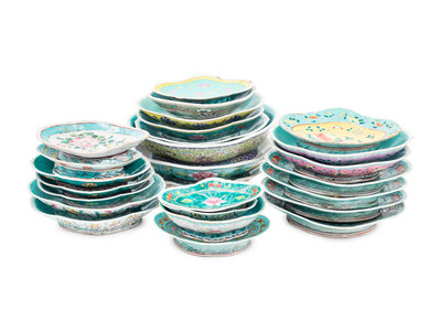 A Group of 26 Chinese Turquoise Ground Famille Rose Porcelain Serving Dishes