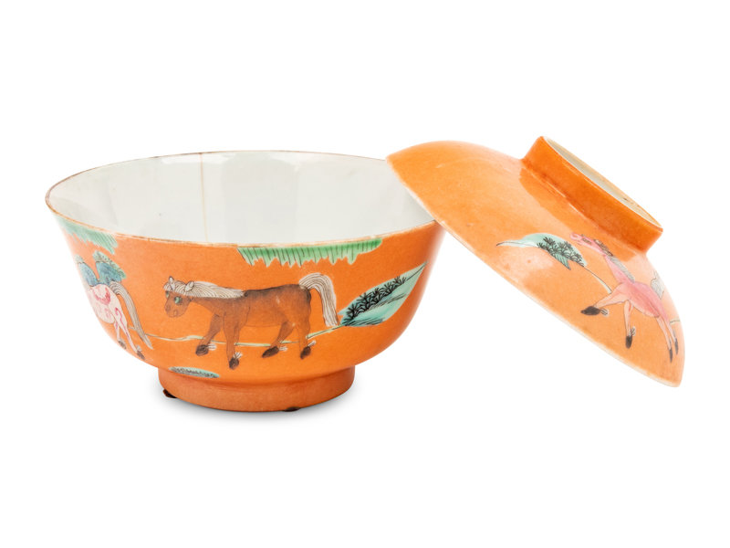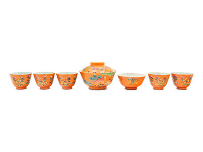 Seven Chinese Coral Red Ground Famille Rose Porcelain Wares