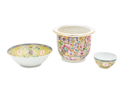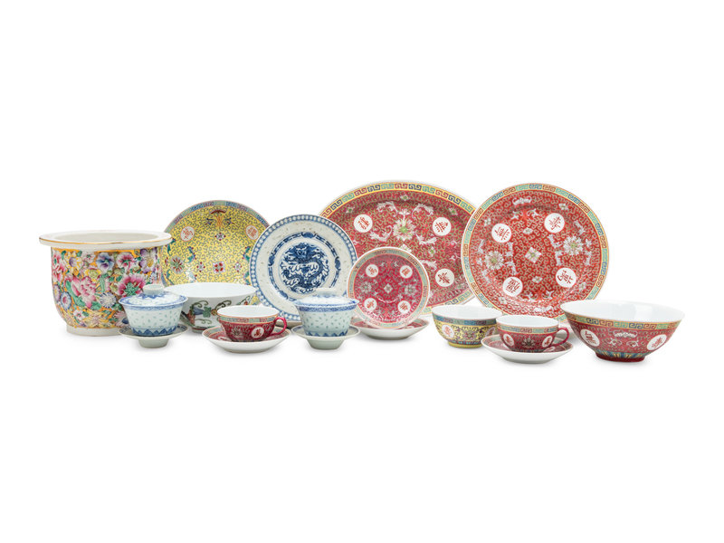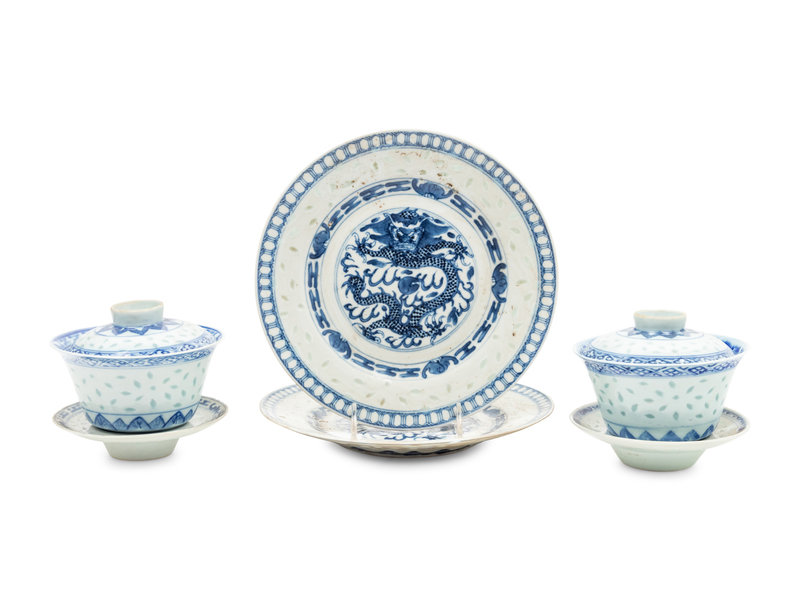 comprising various blue and white 'rice' teabowls and covers with saucers and famille rose teacups, saucers, dishes, and a cachepot: a total of approximately 99 pieces.