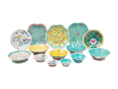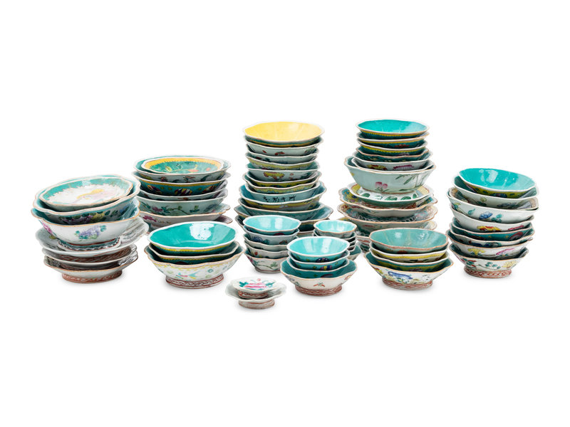 A Collection of 69 Chinese Famille Rose Porcelain Flori-Form Serving Dishes