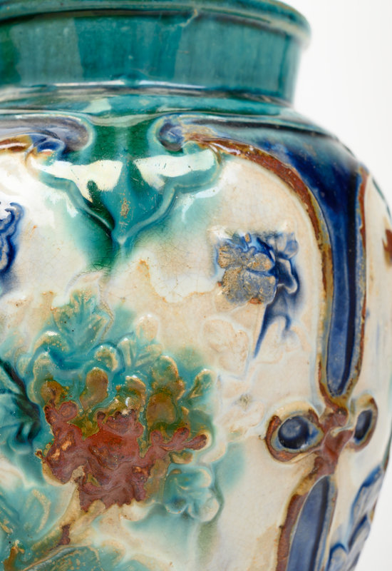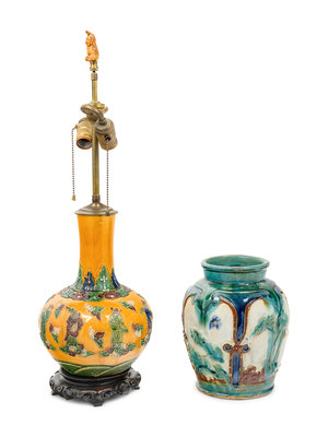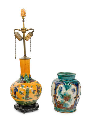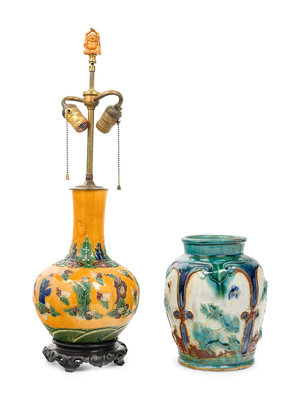 comprising a yellow ground bottle vase mounted as a lampl, and one turquoise ground example.