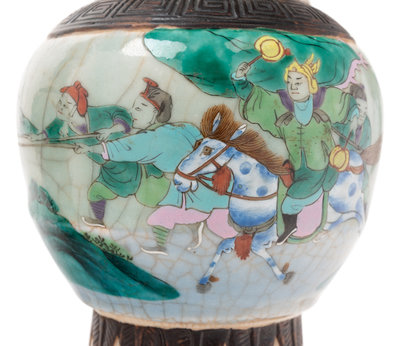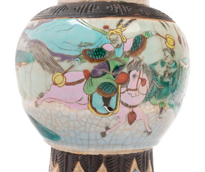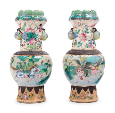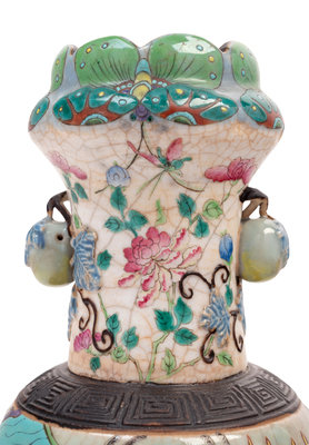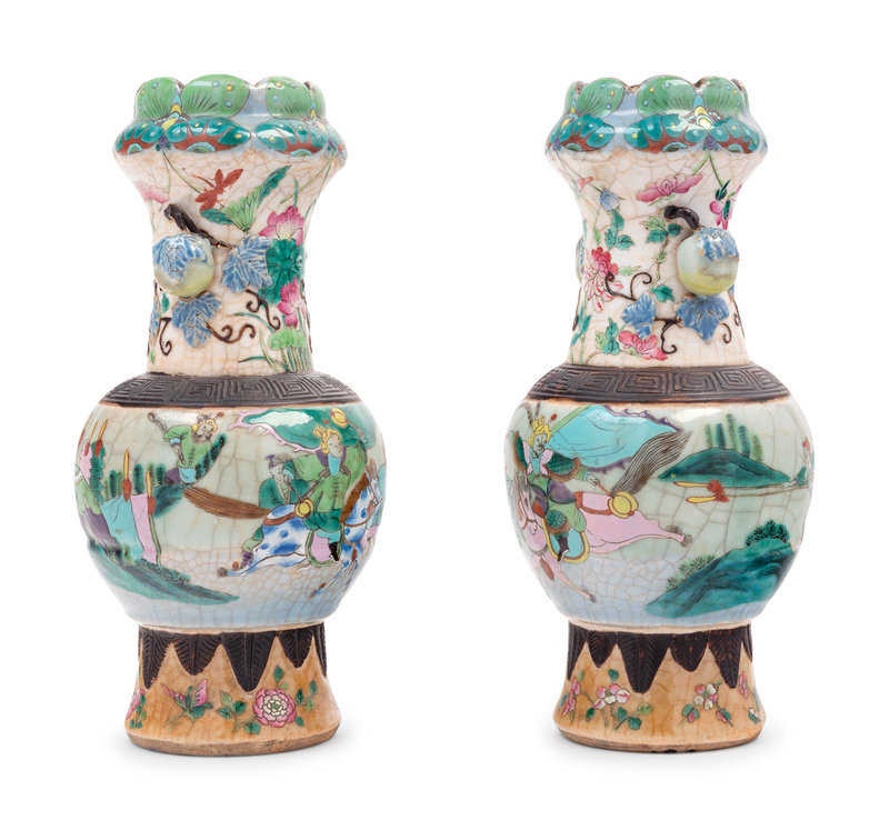 each rising from a straight foot to high rounded shoulders surmounted by a keyfret iron ring, the neck flanked by bulbous handles beneath a similarly molded mouth, decorated to the exterior in polychrome enamels over a pale crackle glaze.