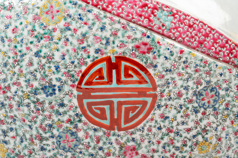 the large figure flushed with a joyful expression, depicted seated in a relaxed upright posture, cloaked in draping robes decorated in vivid polychrome floral diaper interspersed with shou roundels which fall from the shoulders to reveal a rotund belly; the underside impressed with a four-character mark of Zeng Longsheng 曾龙升款.