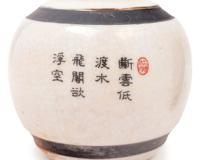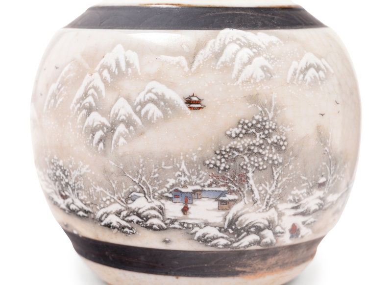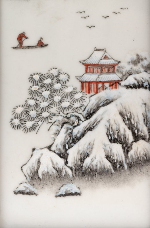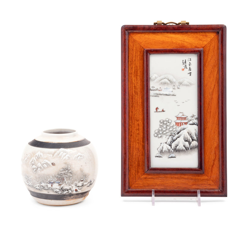 comprising a petite globular iron-decorated jar and a plaque inset in a hardwood frame, each painted with a landscape.