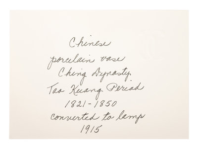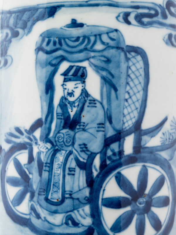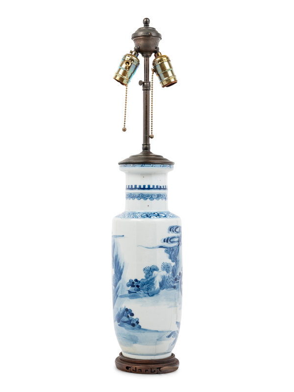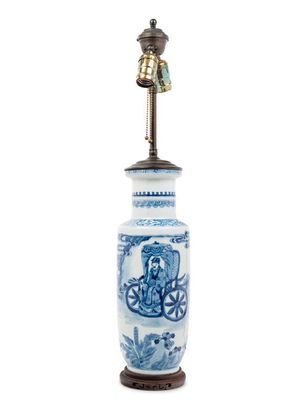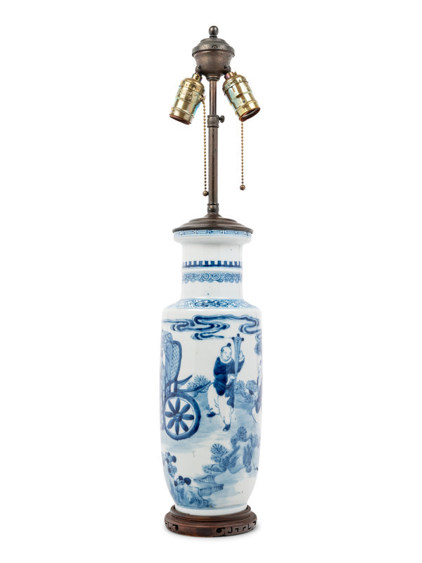 mounted as a lamp, painted with a scholar and his servant boys, the cylindrical neck and mouth rim decorated with bands of keyfret and wave patterns.