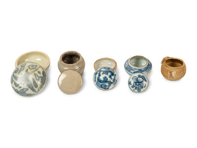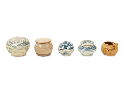 comprising two blue and white covered boxes, one blue and white covered jar, a crackled glazed covered jar and a brown glazed vessel.
