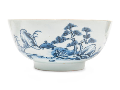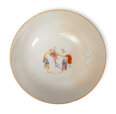comprising two blue and white bowls, a famille rose bird charger, a punch bowl, two 'figure' plates, and a 'birds and flowers' mug.