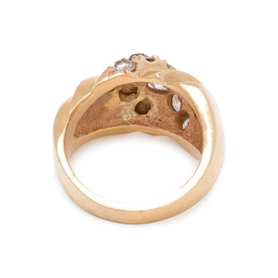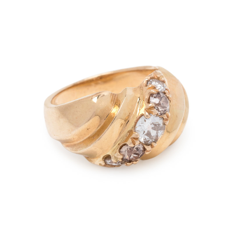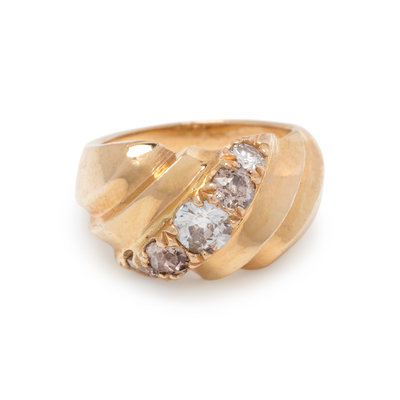 Containing one old European, two round brilliant and two old European cut diamonds and colored diamonds (origin of color not tested) weighing approximately 0.60 carat total. Mounted in yellow gold. Ring size 4.