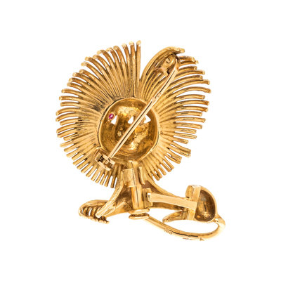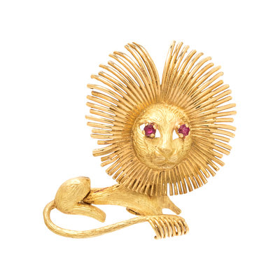 FRENCH, YELLOW GOLD AND RUBY LION BROOCH