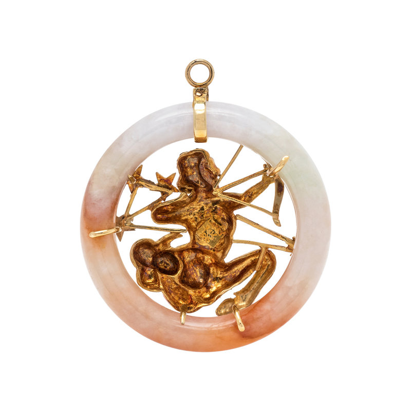 Consisting of an open circular jade pendant with central yellow gold Sagittarius figure. 2 1/8 inches long.