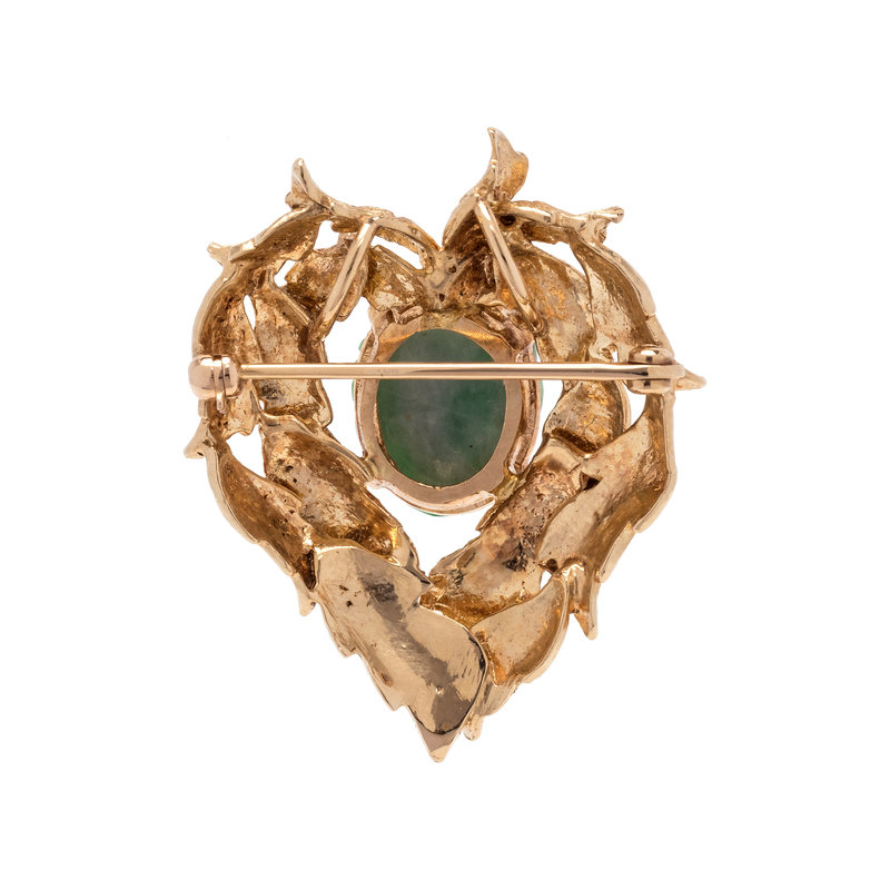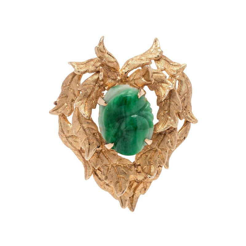 Consisting of a heart shaped textured leaf motif design containing one oval carved jade measuring approximately 14.85 x 11.45 mm. 1 1/2 x 1 1/8 inches.