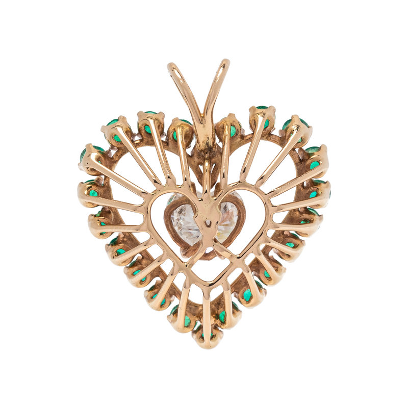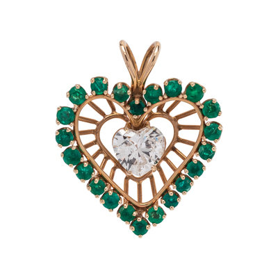 Containing one heart brilliant cut diamond weighing approximately 0.90 carat and 22 round mixed cut emeralds. Mounted in yellow gold. 1 inch long.