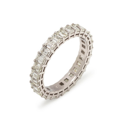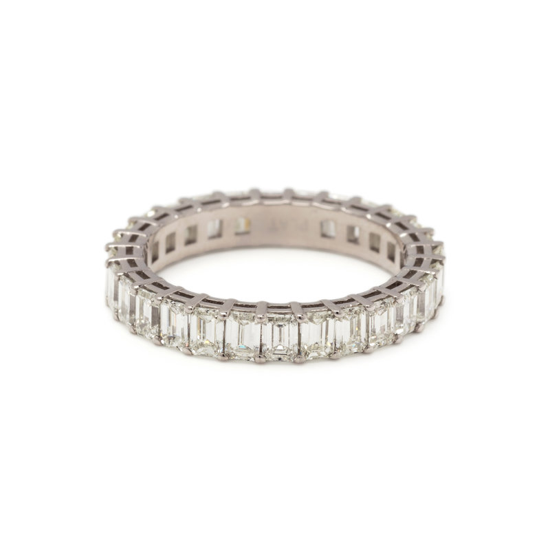 Containing 28 emerald cut diamonds weighing approximately 3.00 carats total. Mounted in platinum. Ring size 6 3/4.