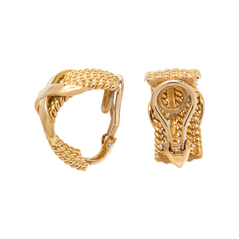 Consisting of multi-row rope half hoop earclips with X motifs. 3/4 inch long.