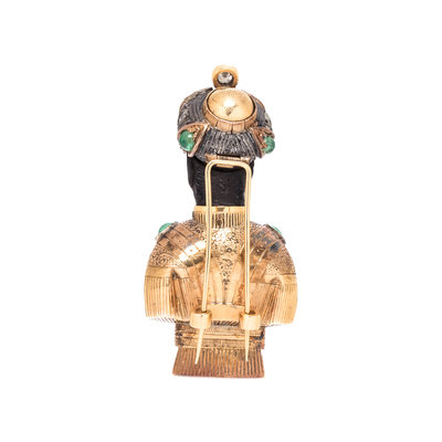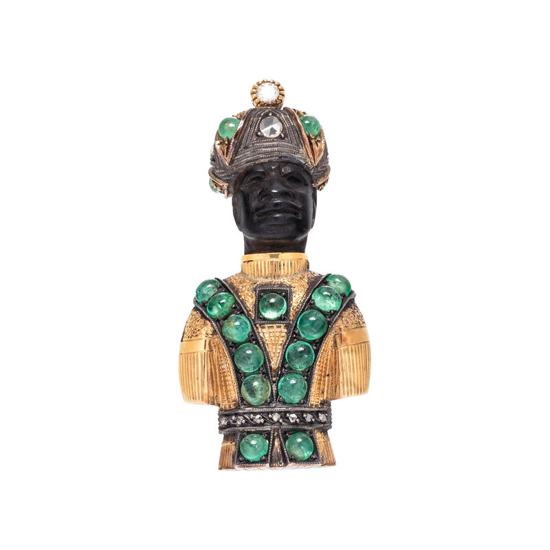 Consisting of a carved ebony male figure with yellow gold and silver mounts containing 17 round and oval cabochon emeralds and 11 round brilliant, rose and mixed cut diamonds. 2 1/2 x 1 1/8 inches.