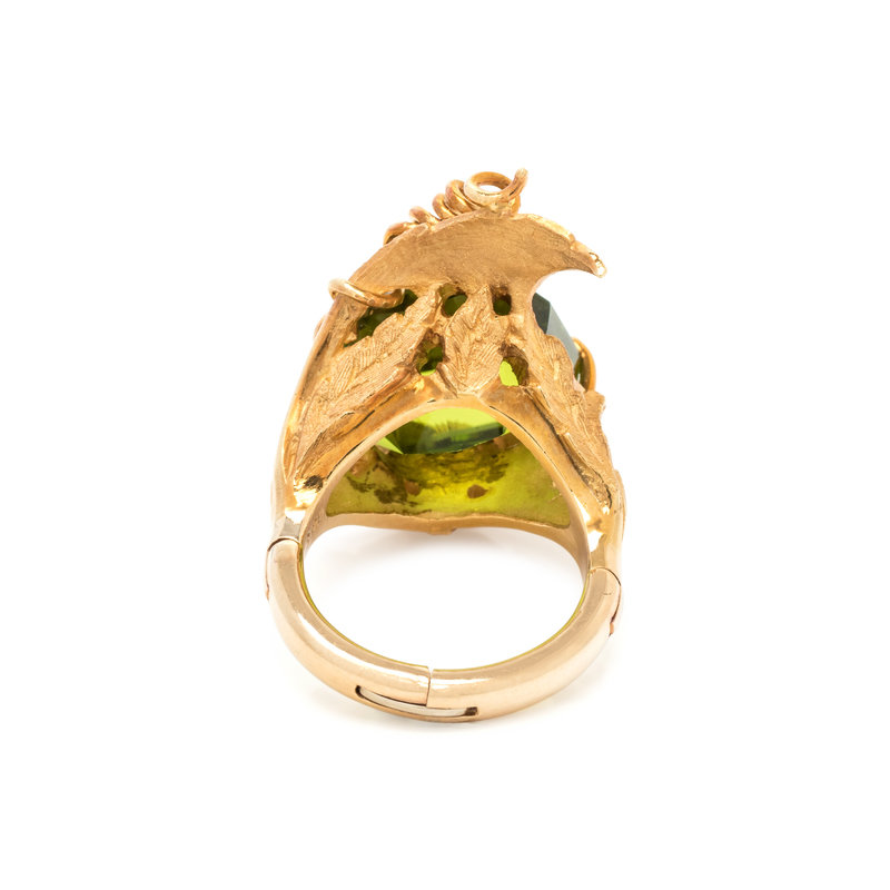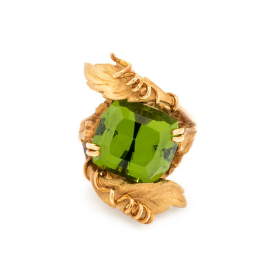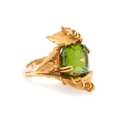 In a textured foliate motif mounting containing one cushion mixed cut peridot measuring approximately 12.00 x 13.30 x 8.90 mm. Ring size 4 3/4.