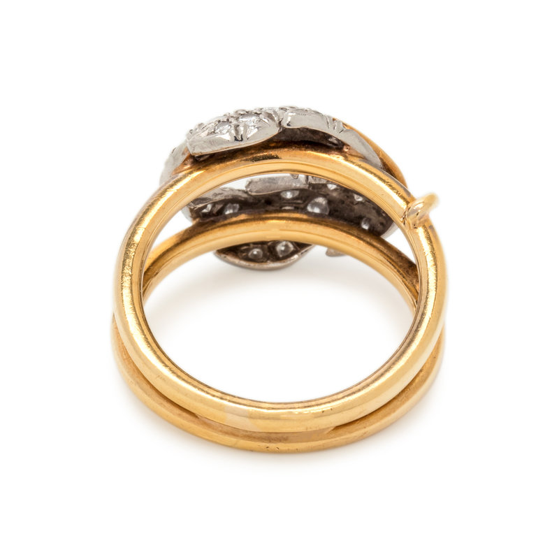 Consisting of a yellow gold ring with platinum leaves containing 26 round brilliant cut diamonds weighing approximately 0.35 carat total. Ring size 6.