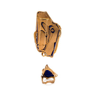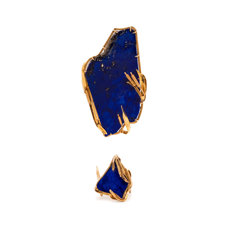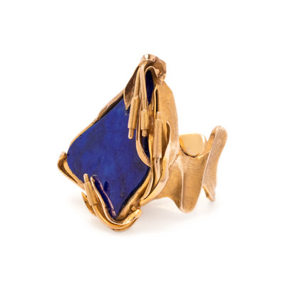 Consisting of a brooch containing one freeform lapis lazuli plaque measuring approximately 75.00 x 37.00 mm with yellow gold cattail motif surround, together with a matching ring containing one freeform lapis lazuli plaque measuring approximately 27.00 x 20.00 mm. Brooch: 3 x 1 3/4 inches. Ring size 8 1/4.