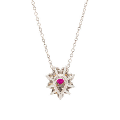 Containing one round mixed cut ruby measuring approximately 4.50 mm in diameter, two marquise and seven round brilliant cut diamonds weighing approximately 0.40 carat total, suspended from a cable link chain. Mounted in platinum. 15 1/8 inches long.