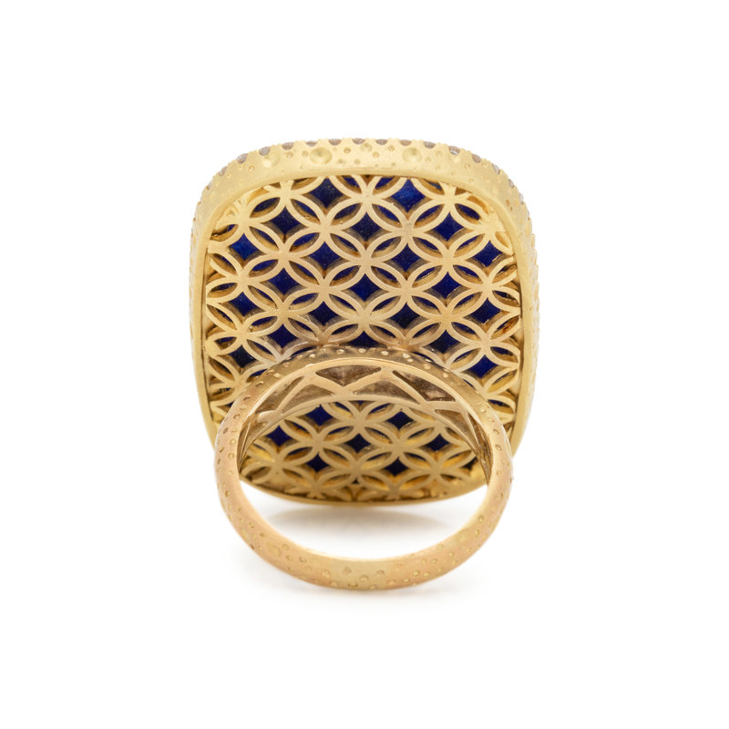 Containing a doublet consisting of one elongated cushion checkerboard cut rutilated quartz backed with lapis lazuli and 62 round brilliant cut diamonds weighing approximately 1.00 carat total. Mounted in yellow gold. Ring size 7 3/4.