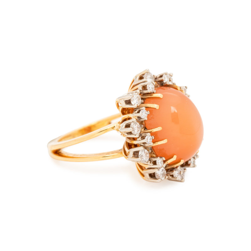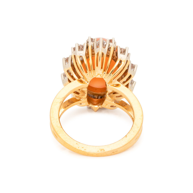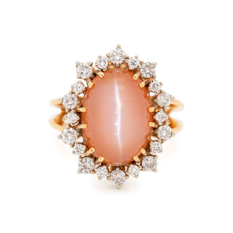 Containing one oval cabochon cat's eye moonstone measuring approximately 14.00 x 9.75 mm and 20 round brilliant cut diamonds weighing approximately 0.80 carat total. Mounted in yellow gold. Ring size 6.