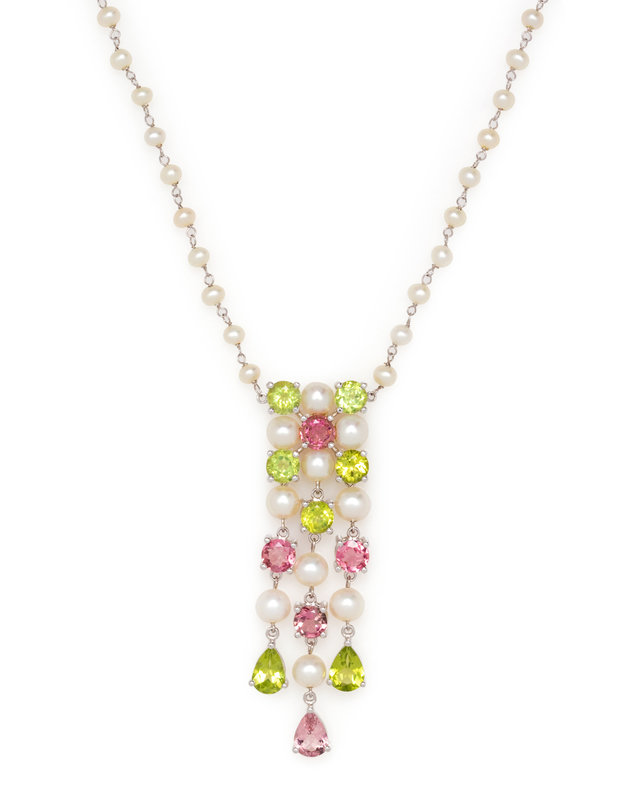 Consisting of a wire link necklace containing numerous pearls suspending a central section containing five round mixed cut and two pear mixed cut peridot, four round mixed cut and one pear mixed cut pink tourmaline and 10 pearls. Mounted in white gold. 17 3/8 inches long.