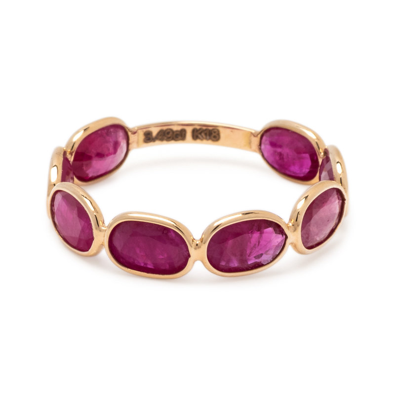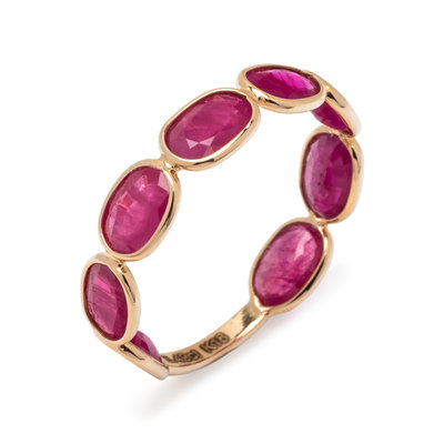 Containing eight oval mixed cut rubies. Mounted in yellow gold. Ring size 6 1/4.
